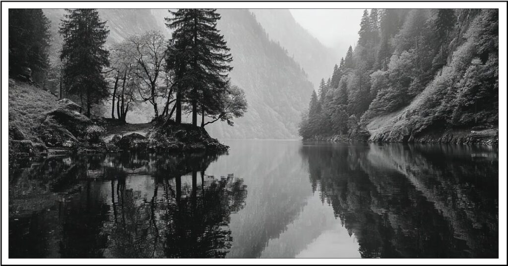 モノクロの写真で、神秘的な湖と思しき風景が写っている。