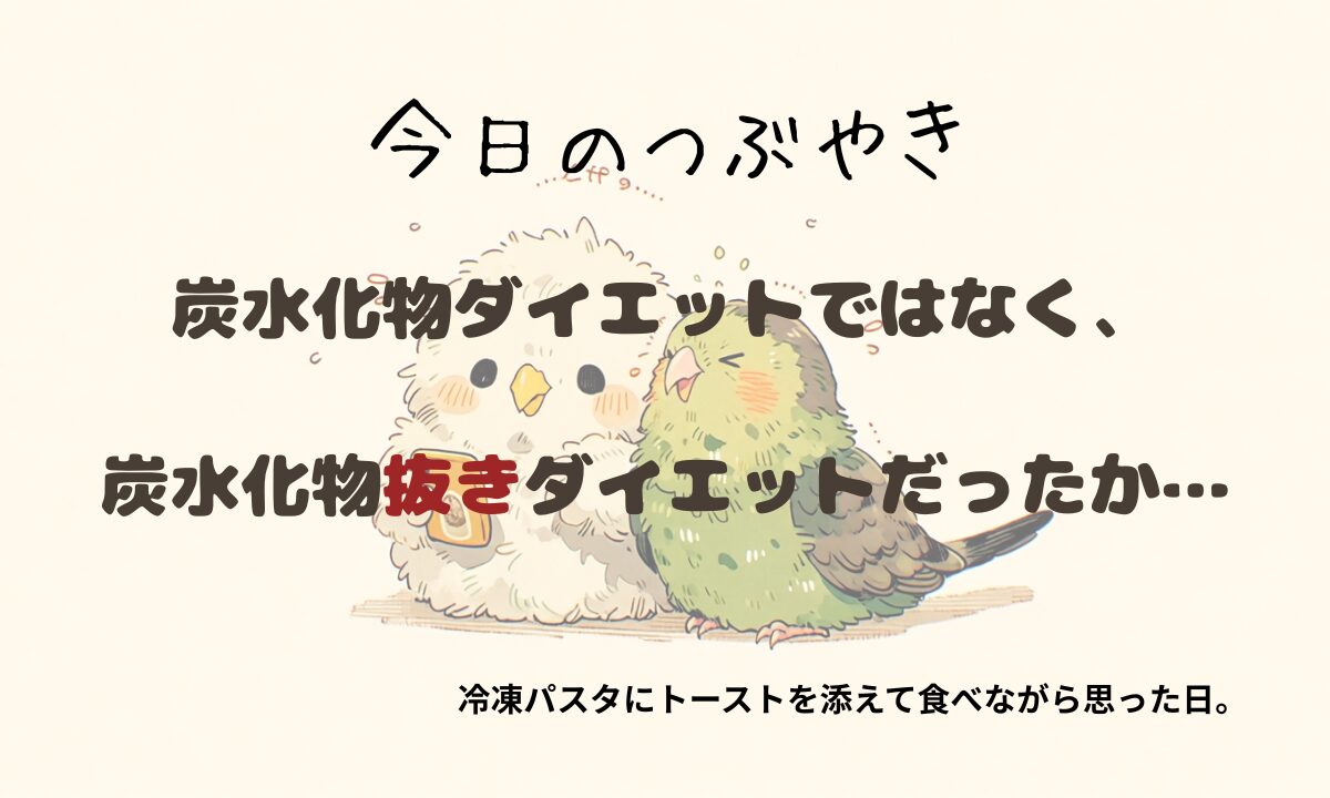 今日のつぶやき 今日のつぶやき|2026年2月6日 illustration:Niji・journey 2026.02.08 「炭水化物ダイエットではなく、炭水化物抜きダイエットだったか⋯」 冷凍パスタにトーストを添えて食べながら思った日。 えっと⋯ダイエットしているんですけど、ダイエットになっていない現状に気づいてしまいました。 なんか、切ない⋯